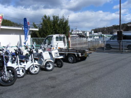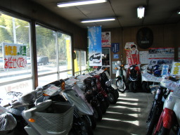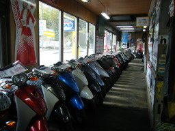 | 八本松駅駐輪場に隣接していますので『通勤通学用』 に使用されるスクーターをメインに展示しています。 当然ご要望に応じて大型自動二輪まで取り扱いOKです。 |